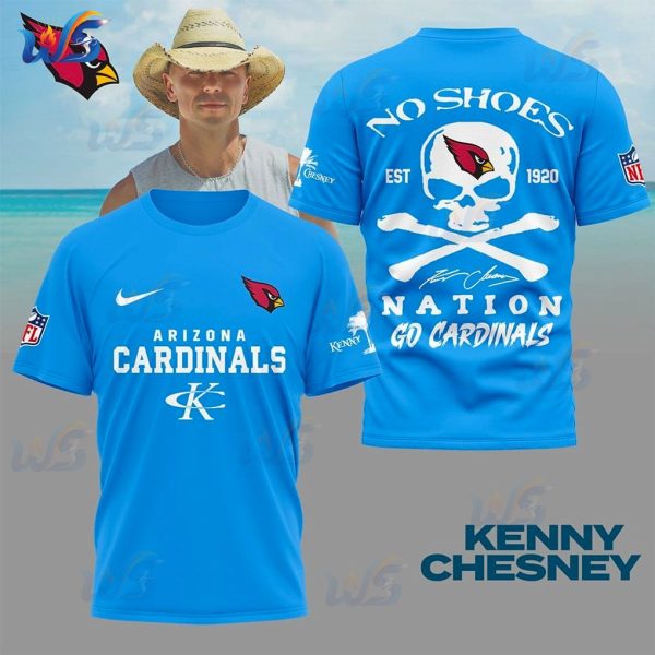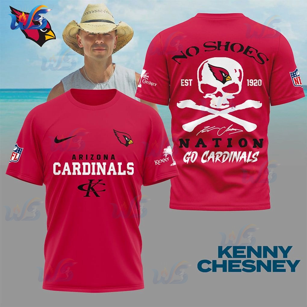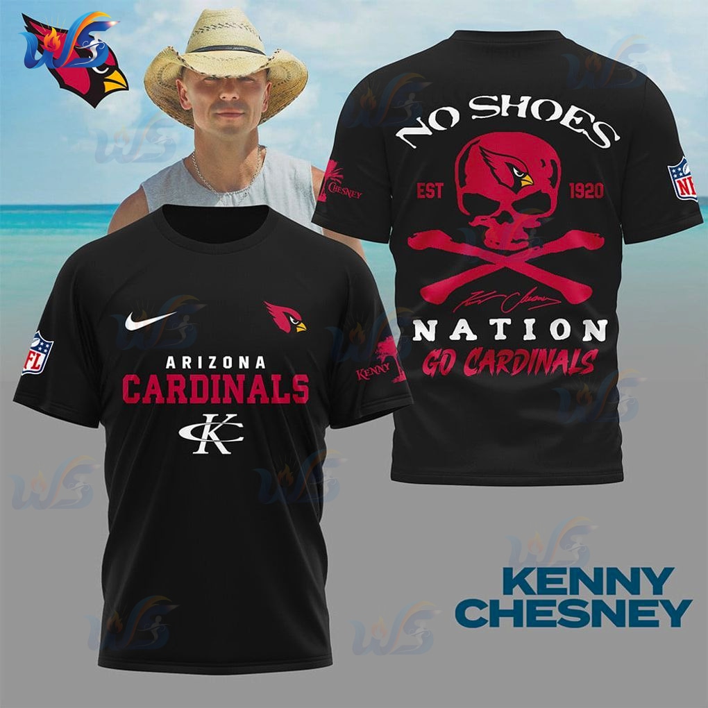 Above the skull, the words “NO SHOES” boldly declare your allegiance to Kenny’s legendary community, accompanied by “EST 1920,” a powerful nod to the Arizona Cardinals’ deep historical roots. And sealing the deal below the skull and bones are Kenny Chesney’s distinct signature, alongside the resounding declarations “NATION” and “GO CARDINALS.” This isn’t just text; it’s a call to arms, a collective cheer, a shared identity.