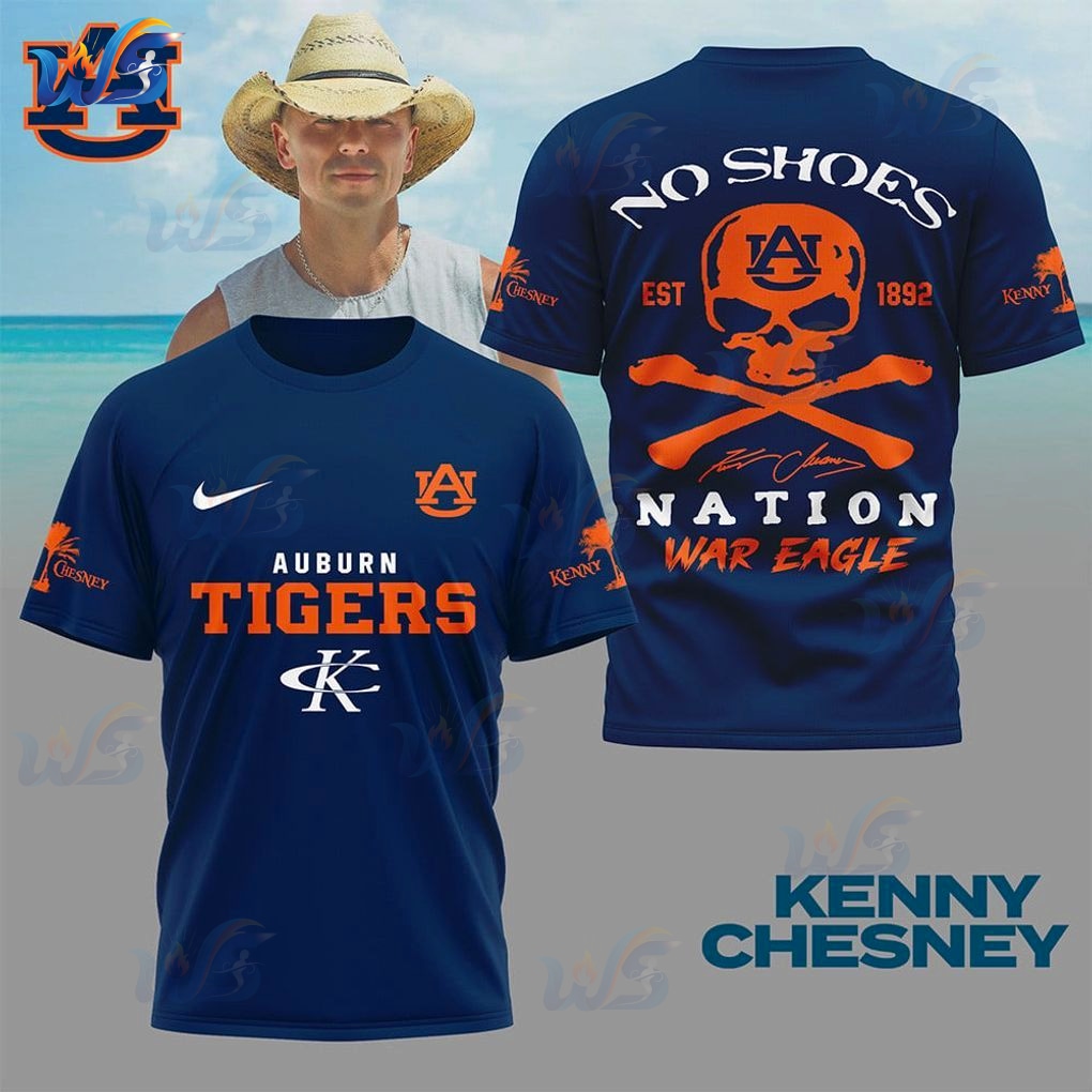 The design of this fan tee directly addresses the problem many fans face: how to authentically blend diverse passions without compromise. Where other fan apparel might force you to choose between your team and your music, this shirt succeeds by integrating key elements from both worlds. The prominent Auburn Tigers logo on the front, coupled with the classic “Auburn Tigers” lettering, clearly declares your allegiance to the War Eagle spirit. However, this isn’t just another game day shirt. The subtle yet impactful swoosh on the chest isn’t merely a brand identifier; it signifies an expectation of quality and athletic comfort, preventing the common issue of flimsy fan gear that doesn’t stand up to enthusiastic wear. On the sleeves, you’ll notice the Kenny Chesney “K” logo alongside subtle palm tree graphics. This thoughtful placement solves the problem of feeling like you’re wearing two separate shirts; instead, it creates a cohesive look that honors both affiliations naturally. But the real problem-solving power is on the back: the “No Shoes Nation” skull, emblazoned with the Auburn logo, and crossed bones, along with “War Eagle,” and Kenny Chesney’s signature. This bold graphic isn’t just eye-catching; it’s a masterclass in blending two distinct fan cultures. It directly addresses the frustration of having to explain your diverse interests by letting your shirt speak for itself. The “EST 1892” detail subtly reinforces Auburn’s long-standing tradition, ensuring historical pride isn’t lost in the blend. The choice of iconic orange and blue, or the other color variations, ensures that your team spirit is unmistakably represented, while the “No Shoes Nation” vibe adds that unique, laid-back persona. This thoughtful combination eliminates the awkwardness of trying to combine disparate items, offering a singular, impactful solution for the multifaceted fan.