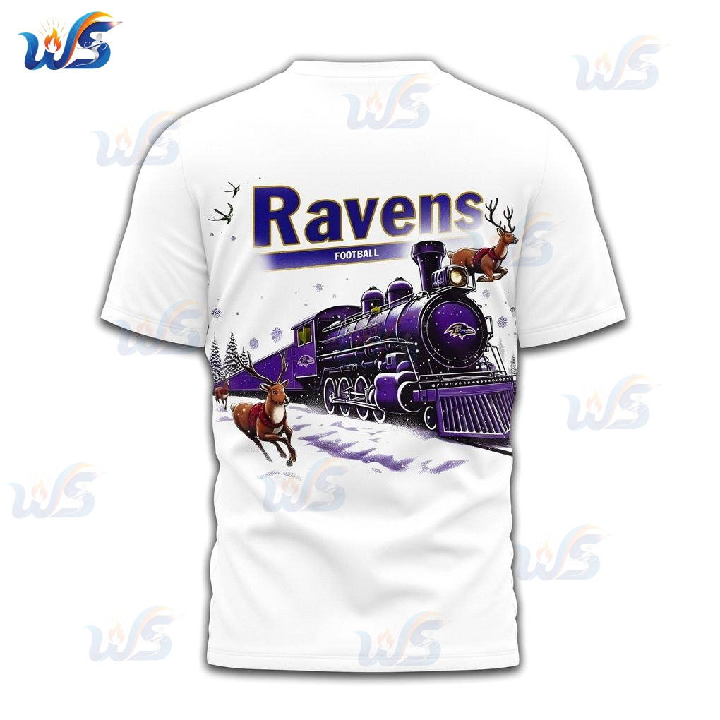 Where other holiday shirts might just feature a single logo, this design prevents the feeling of being overlooked by offering rich detail on the back too. A powerful purple steam train, symbolizing strength and journey, plows through a snowy landscape, surrounded by leaping reindeer, all crowned by the prominent “Ravens FOOTBALL” and the team logo. This intricate scene eliminates the “plain back” problem found on many shirts, providing captivating visual interest from every angle. Moreover, choosing a comfortable t-shirt fabric over a heavy, often itchy sweater directly solves the problem of discomfort for indoor holiday gatherings or for fans in warmer climates, ensuring you can celebrate with ease and prevent overheating.