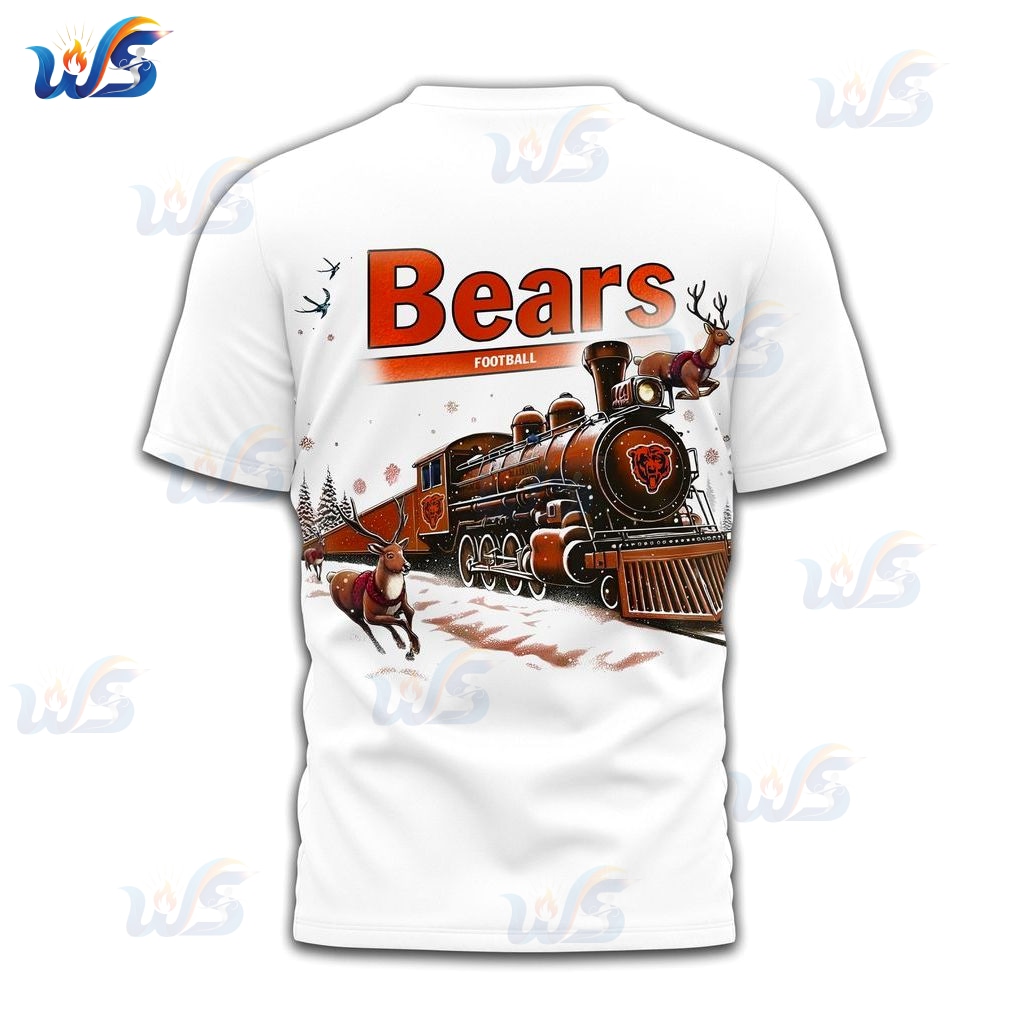 On the back, the design solves the deeper problem of blending tradition with festivity. The grand, vintage-style train, carrying reindeer through a snowy landscape, is more than just a picture; it’s a narrative element that elevates the shirt beyond typical merchandise. This thoughtful imagery prevents the “one-day wear” syndrome often associated with holiday items. The inclusion of the Bears logo on the train ensures your team allegiance remains front and center amidst the festive scene. This specific design choice addresses the concern of many fans who want something more sophisticated than a cartoonish holiday theme. It celebrates winter wonder and Bears football simultaneously.