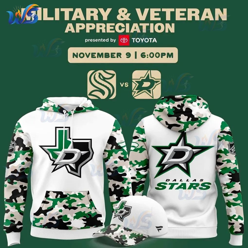 The chill hits you the moment you step out of the car, but it’s a good kind of chill – the anticipation of the puck drop, the roar of Stars Nation echoing through the arena, the electric atmosphere that only a Dallas Stars game can deliver. It’s more than just a game; it’s a gathering of a family, a community united by Victory Green and unwavering passion. Now, imagine wearing something that not only broadcasts your dedication to our beloved Stars but also pays a heartfelt tribute to the brave men and women who have served our nation. While others might settle for generic fan gear, we know the true fan seeks a deeper connection, a story woven into every stitch. This isn’t just a hoodie; it’s a symbol of dual pride, born from the creative vision to honor both our heroes on the ice and our heroes in uniform. The designers poured their hearts into crafting a piece that speaks volumes, bridging the gap between game-day energy and profound respect, setting it light-years apart from the usual, uninspired fan apparel. It’s designed for you, the fan who understands the power of community, on and off the ice.