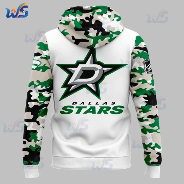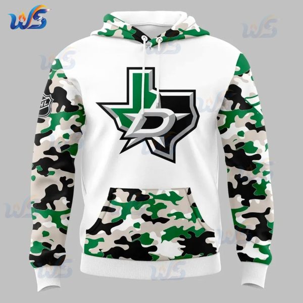 Step into the spotlight with our Dallas Stars 2025 Military Appreciation Camo White Hoodie, a design that masterfully blends bold team spirit with a profound gesture of respect. From the moment your eyes land on it, the visual story unfolds. The central canvas is a crisp, brilliant white, chosen by our designers to symbolize clarity, unity, and to provide a striking contrast that makes every detail pop. This isn’t just a random color choice; it’s a deliberate decision to ensure our iconic Dallas Stars imagery truly shines.