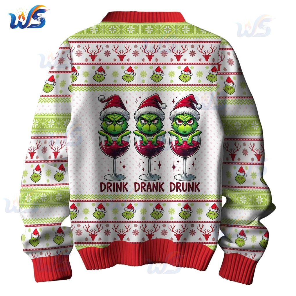 Turn around, and prepare for the grand finale on the back. Here, the designer’s playful vision truly comes to life with a witty narrative continuation. Three of our beloved green characters, each donning a Santa hat, are depicted in various stages of festive merriment, each nestled comfortably in a vibrant red wine glass. Their expressions range from grumpy-chic to blissfully content, perfectly encapsulating the phrase boldly printed beneath them: “DRINK DRANK DRUNK.” This clever progression tells a story, making the sweater a dynamic piece of wearable art. The same charming pattern of green character faces, red deer antlers, and snowflakes continues seamlessly across the back, ensuring a cohesive and detailed aesthetic throughout.