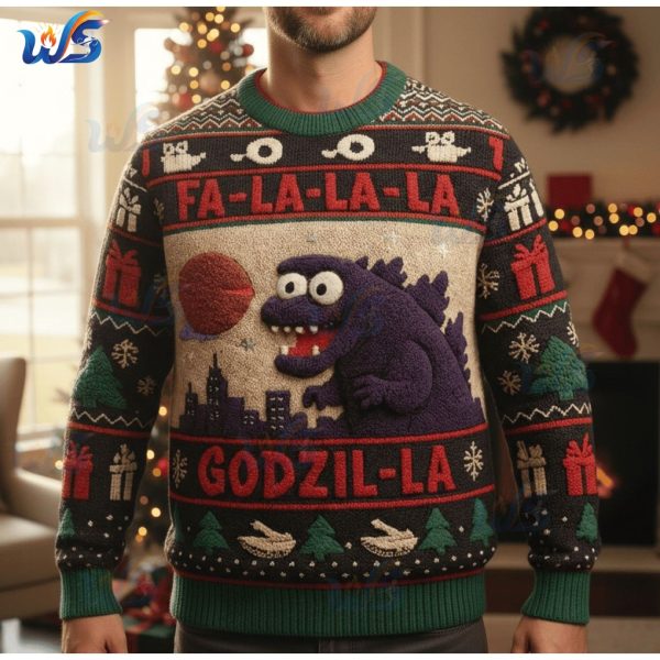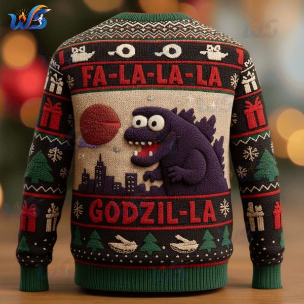 Above this magnificent scene, proudly knitted in a bold red with a crisp white outline, is “FA-LA-LA-LA,” a playful nod to holiday carols, reimagined with a monstrous twist. And just below our textured titan, equally prominent, “GODZIL-LA” (or a similar iconic name that echoes the monster’s spirit) completes the lyrical jest, bridging two worlds with a smile. These aren’t just printed words; they’re intricately knitted into the fabric, showcasing the superior craftsmanship and attention to detail.
