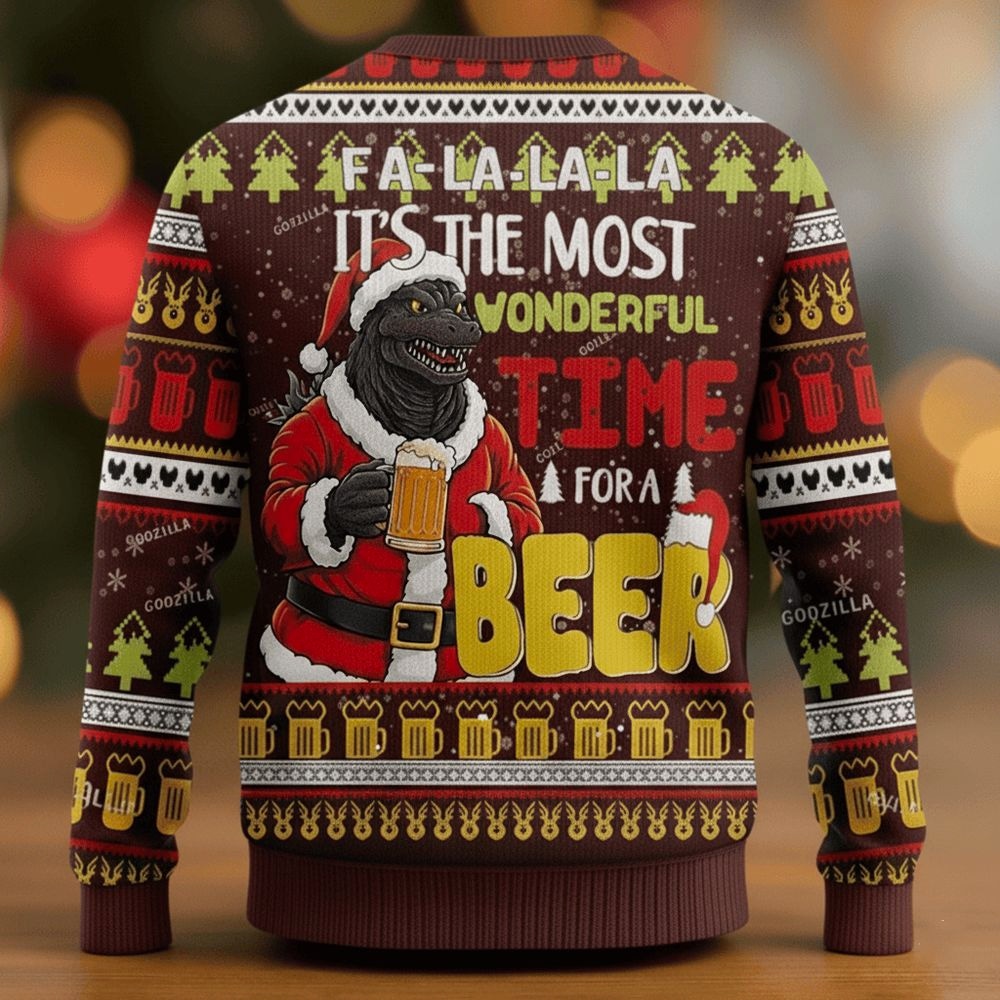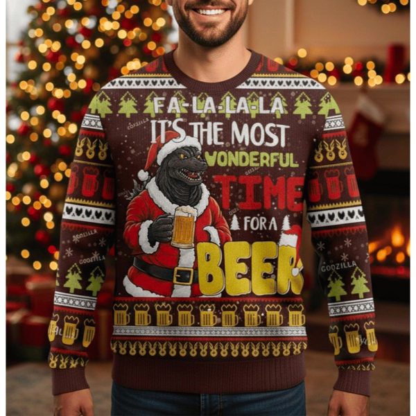 Furthermore, the integration of classic “ugly sweater” patterns—like snowflakes, Christmas trees, and repeating beer mugs—alongside subtle “Godzilla” text, is a crucial design choice. This prevents the common problem of a sweater being too niche or too generic. The design choice solves the problem of feeling out of place because it offers a perfectly balanced level of festive fun without crossing into genuinely tacky territory, ensuring you feel confident and appropriately themed. They positioned the “FA-LA-LA-LA IT’S THE MOST WONDERFUL TIME FOR A BEER” text prominently specifically to solve the customer problem of having to explain their shirt. The entire graphic package ensures you won’t blend into the background; instead, it guarantees you won’t blend into the background, making you a memorable presence. This sweater provides a specific, targeted solution for fans of unique pop culture and casual holiday cheer, eliminating the struggle to find something that truly resonates.