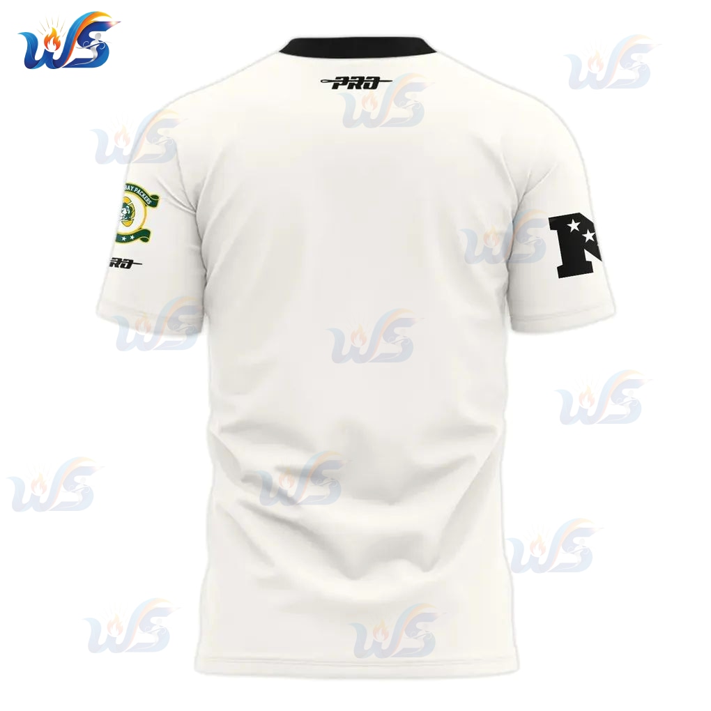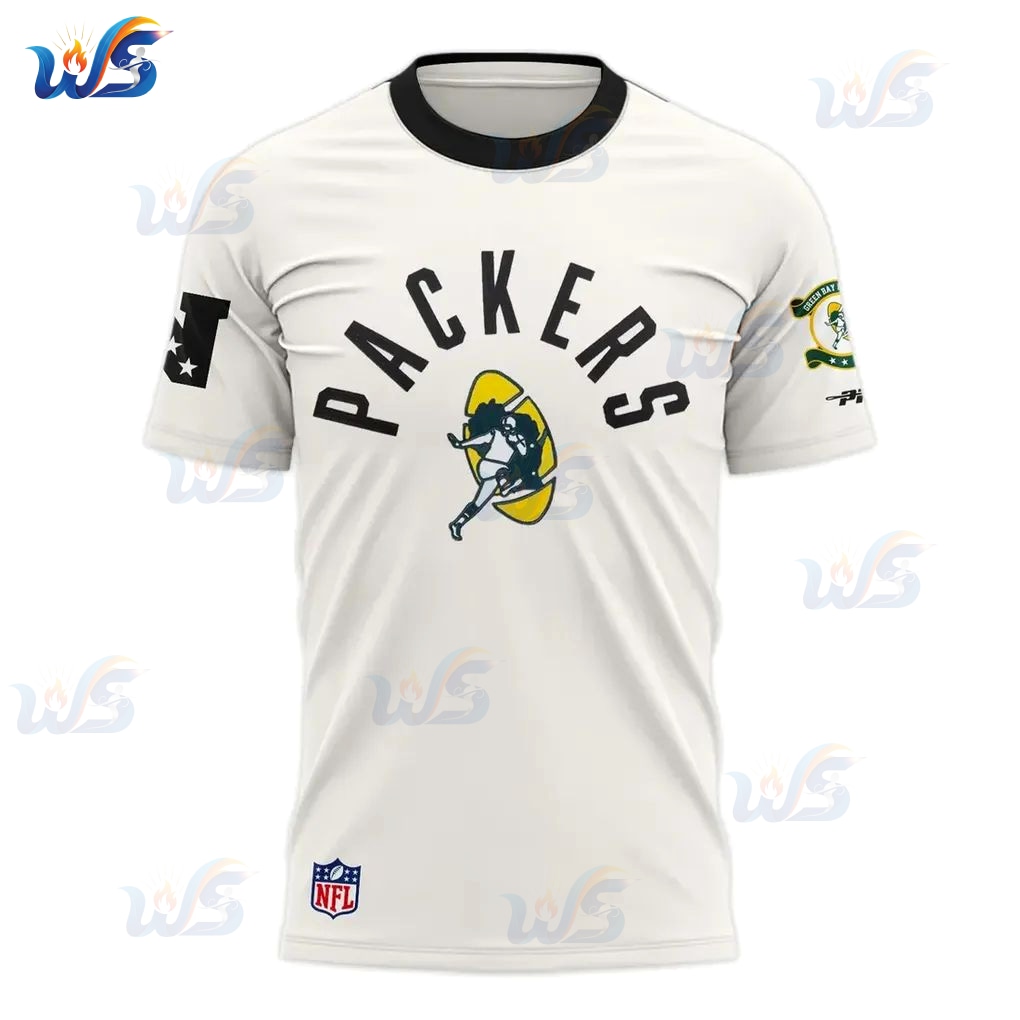Where other designs might suffer from stiff, unappealing prints, the bold, arched “PACKERS” text over the iconic classic “G” logo on the chest is expertly integrated. This careful placement and print quality prevents the common problem of logos cracking or peeling after just a few washes, ensuring your shirt maintains its sharp look. This solution means you won’t have to deal with the annoyance of a prematurely aged logo. Furthermore, the stylized “P” on one sleeve and the detailed circular “Green Bay Packers” badge on the other are not just aesthetic additions. They address the problem of generic fan apparel by serving as exclusive, high-quality accents that signal this isn’t a mass-produced item. These unique details prevent your shirt from looking like every other fan’s, providing a tangible way to showcase your dedication with a truly distinctive, collector’s item feel. The “PRO” detail on the back collar also subtly assures a standard of quality, preventing the frustration of flimsy material often found in less thoughtful designs.