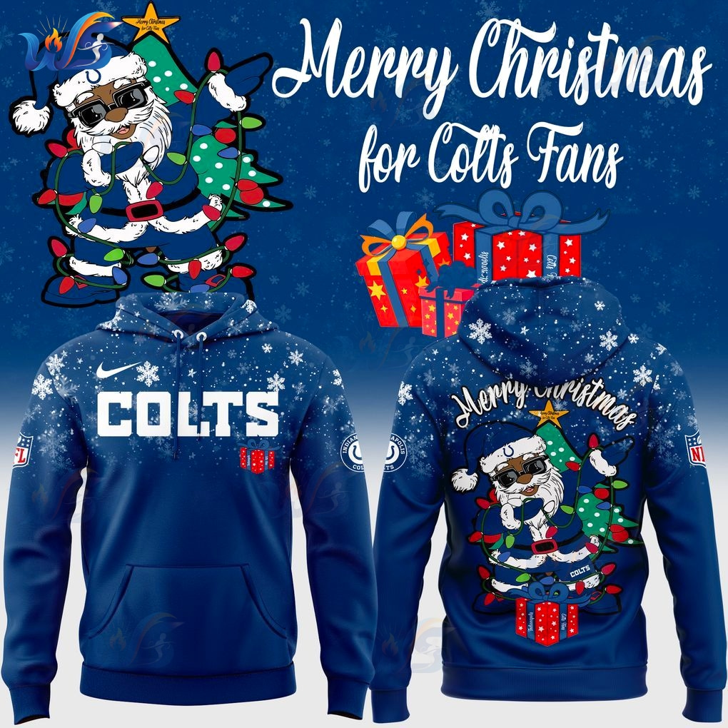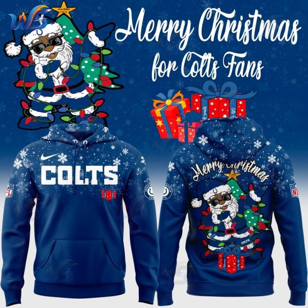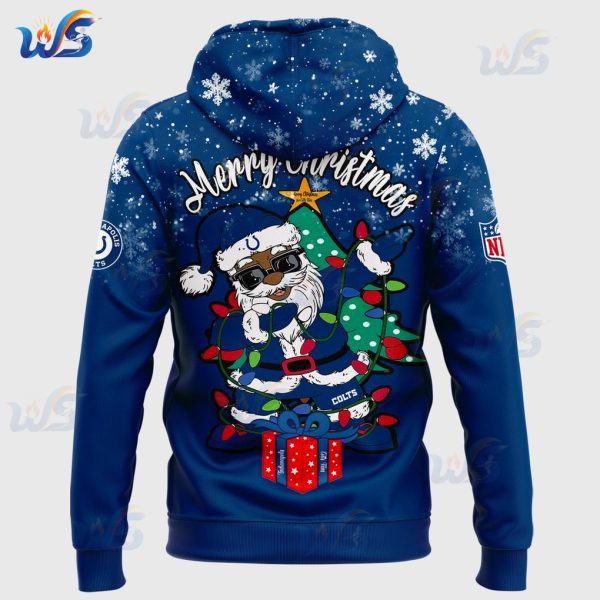 On the front, you’ve got that iconic “COLTS” text displayed prominently, so there’s no mistaking your allegiance. Above it, a subtle swoosh hints at the quality you can expect, while the NFL shield and the familiar Colts horseshoe logo on the sleeves assure you it’s officially licensed gear. But it’s the back of these pieces where the party really starts. The centerpiece is definitely the dabbing Santa Claus, wearing his Colts blue suit, cool sunglasses, and a hat adorned with the team’s horseshoe emblem. He’s cleverly posed with a Christmas tree wrapped in string lights, with more Colts details subtly woven into the design, like the “COLTS” text on Santa’s belt. Above this playful scene, “Merry Christmas” is scripted in a festive font, all against a backdrop of falling snowflakes, connecting the front’s winter theme to the back’s full-blown holiday celebration. Everything works together because the colors are consistent and the theme is clearly defined, making it a cohesive and truly spirited design.