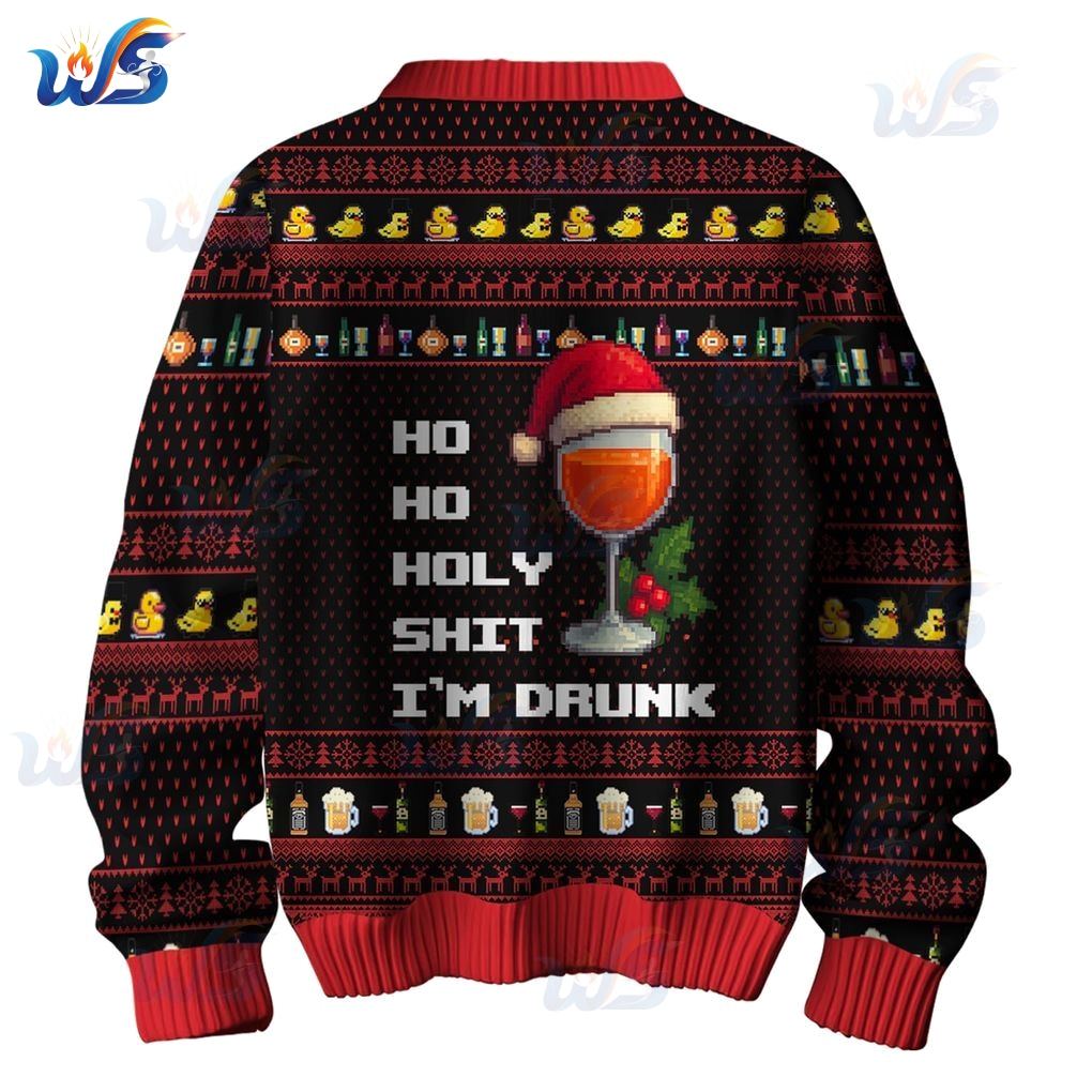 We always suggest turning this Christmas ugly sweater inside out before washing on a cold cycle and laying it flat to dry. This helps protect the knit and keeps the vivid colors and pixelated design looking sharp for many seasons. Pro tip: avoid high heat in the dryer – it’s a sweater, it’ll thank you for gentle treatment! Many people pair this with their favorite comfy jeans for a casual look, or dress it up slightly with dark trousers for a holiday party. We’ve seen it styled with everything from flannel shirts to a simple tee. If you’re heading to an ugly sweater party, definitely show off the back – that ‘HO HO HOLY SHIT I’M DRUNK’ line is a guaranteed crowd-pleaser and often wins awards! It’s also surprisingly versatile for just lounging at home when you want to feel festive and cozy. Keep in mind it’s still a sweater, so snagging can happen if you’re not careful. It’s a fun, statement piece, and it absolutely delivers.