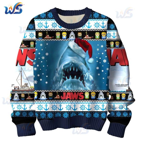Let’s dissect the incredible artistry woven into every stitch (or, more accurately, printed with vibrant precision) of this garment. The front of the sweater is an undeniable showstopper, dominated by a formidable, wide-mouthed shark – the very beast that haunted Amity Island’s shores – now sporting a jaunty Santa hat. This central image isn’t just a simple graphic; it’s rendered with stunning detail, showcasing the shark’s menacing teeth and the eerie depth of its gaze, all set against a backdrop of crisp, falling snowflakes and an icy-blue atmosphere that hints at a colder, more treacherous ocean. Below this iconic scene, the word “JAWS” is emblazoned in bold, crimson red, a stark and familiar reminder of the film’s chilling legacy.