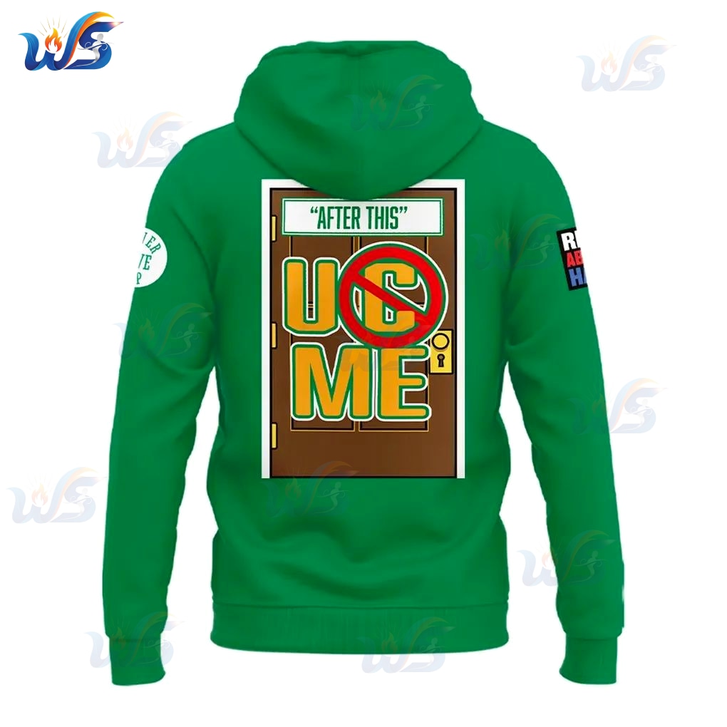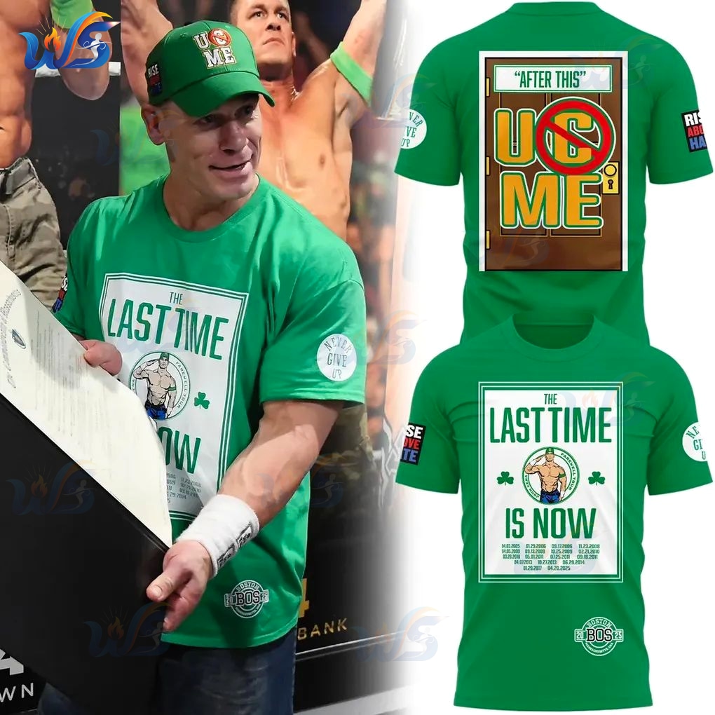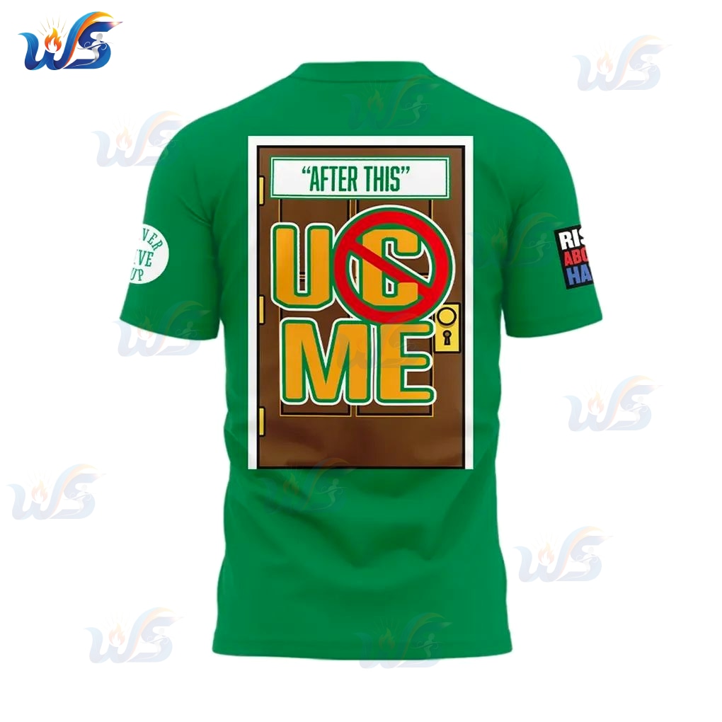 The distinct “U C ME” back design, famously incorporating the “no” symbol over the “C,” is a direct solution for fans wanting to boldly showcase classic Cena iconography. This specific element eliminates the annoyance of subtle designs that might not be immediately recognizable to fellow enthusiasts, ensuring instant recognition and fostering shared understanding within the fan community. The strategic inclusion of both shamrocks and a Boston 2025 logo on the front explicitly solves the problem of generic commemorative gear by tying the apparel directly to the farewell event’s specific location and date. This design choice prevents disappointment with items that could be for any event, ensuring fans have gear that is truly unique to the Boston 2025 farewell. Furthermore, the “NEVER GIVE UP” and “RISE ABOVE HATE” sleeve graphics eliminate the common frustration of having to explain Cena’s core mottos; these elements ensure his inspirational messages are always visible, reinforcing his enduring legacy and preventing the problem of superficial fan wear.
