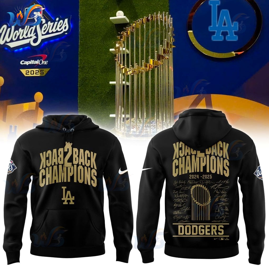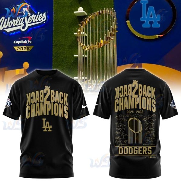 - The Narrative Unfolds on the Back: Turning to the back reveals an even deeper layer of storytelling. The “BACK 2 BACK CHAMPIONS” mantra is repeated, but now amplified with the definitive “2024 – 2025” dates, concretizing the dream of consecutive titles. Below this, the design truly differentiates itself: a captivating graphic element resembling a championship trophy, artfully filled with what appear to be simulated player signatures. This isn’t just a generic graphic; it’s our designer’s tribute to the collective effort, the individual heroes, and the unified spirit required for such a monumental achievement. Each ‘signature’ represents a piece of that journey, making the garment feel deeply personal, as if you’re carrying a piece of the team’s future legacy with you. Beneath this powerful visual, the unmistakable “DODGERS” name is proudly emblazoned in the same striking gold, leaving no doubt about the champions we celebrate. A smaller, subtle white swoosh-like emblem appears again near the bottom hem, reinforcing the quality and athletic inspiration. Finally, near the top right shoulder, a distinctive circular patch-like detail (resembling the World Series logo) subtly signals the pinnacle of achievement. Our aim was to create a design that offers both a powerful front-facing declaration and a rich, detailed narrative on the back – a true collector’s piece.