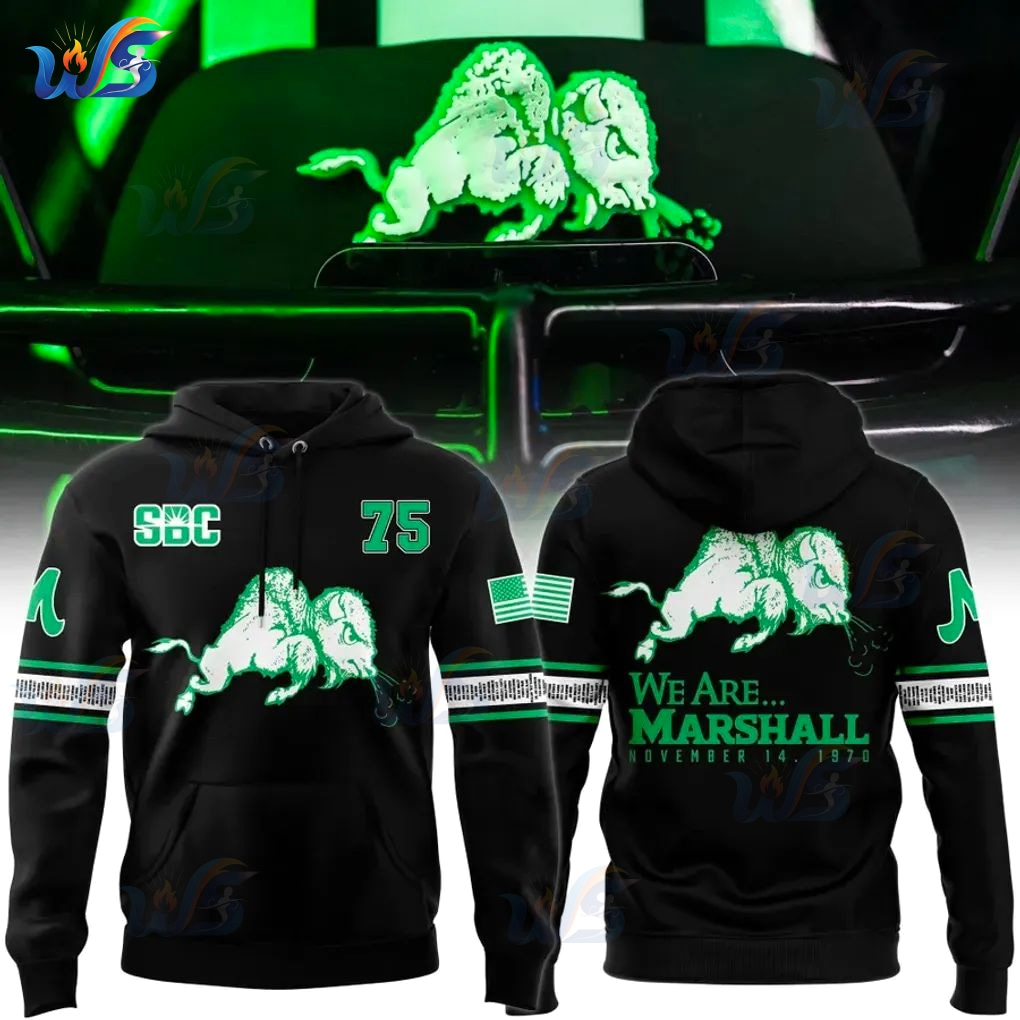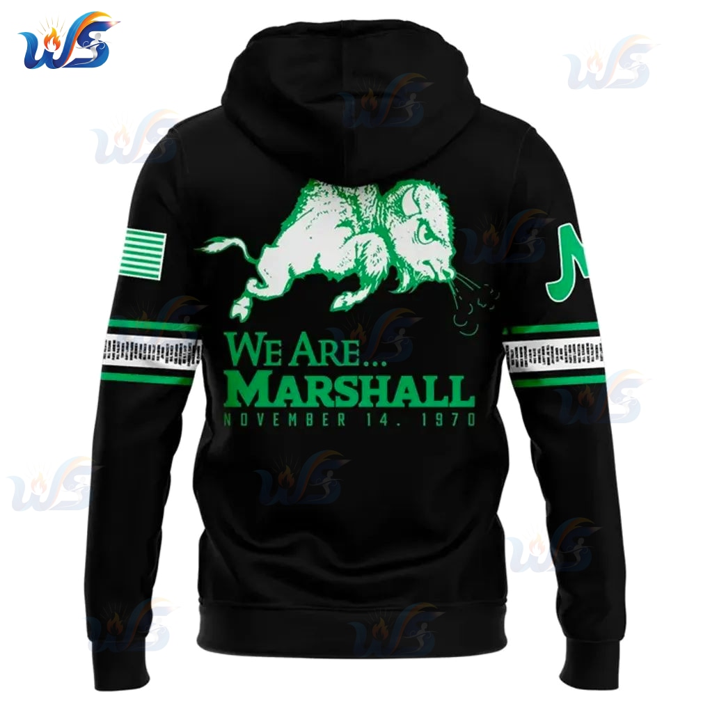 The Marshall Thundering Football We Are Marshall Black 2025 Hoodie design directly addresses the problem of generic fan gear by integrating iconic elements that speak volumes. The bold “WE ARE… MARSHALL” emblazoned across the back isn’t just a slogan; it’s a profound statement of unity, resilience, and unwavering support. Below it, the solemn “NOVEMBER 14, 1970” date immediately connects wearers to a pivotal and defining moment in Marshall history. This isn’t just a design; it’s a powerful conversation starter and an emblem of remembrance, ensuring you’re not just wearing a logo, but carrying a legacy that deeply resonates with every true fan.