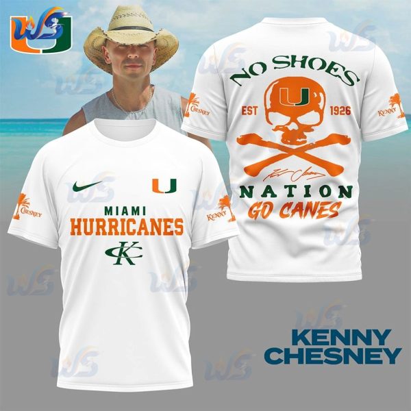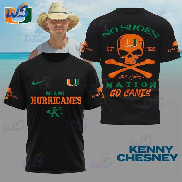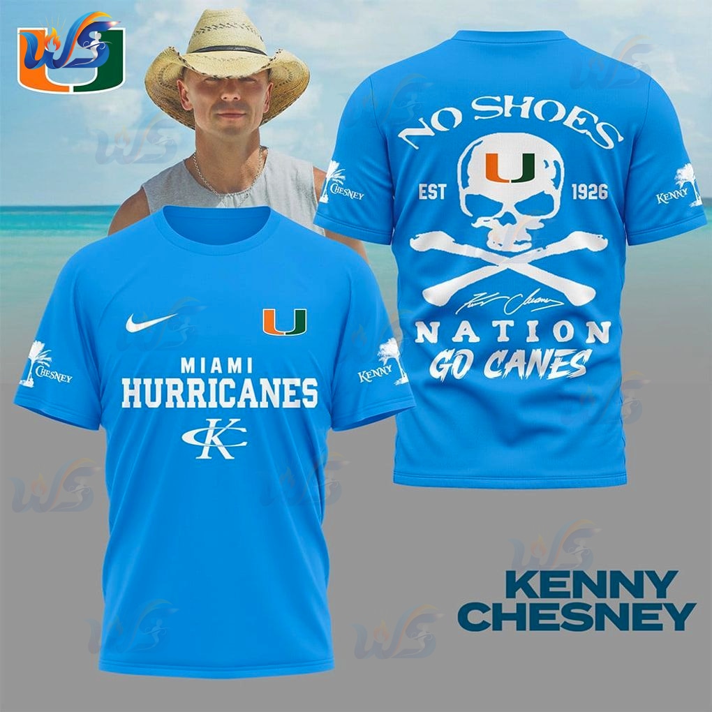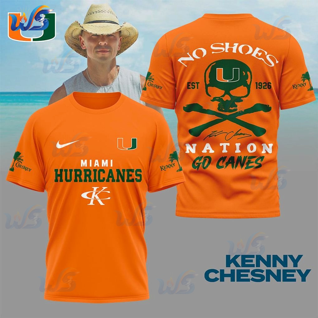 The biggest hurdle for fans of both Hurricanes game days and Kenny Chesney’s “No Shoes Nation” rhythm is finding a design truly representing both. Most merchandise offers only one side, leaving you feeling incomplete. This unique Miami Hurricanes Kenny Chesney T-Shirt design directly addresses that problem. Where other fan apparel forces a choice, this shirt blends iconic elements from both worlds. On the front, prominent ‘MIAMI HURRICANES’ text, with the classic ‘U’ logo and swoosh, instantly projects unwavering team loyalty. Then, Kenny Chesney’s ‘K’ logo and the small ‘Chesney’ palm tree on the sleeve signals your ‘No Shoes Nation’ allegiance. This solves the problem of needing multiple shirts or showing only half your identity.