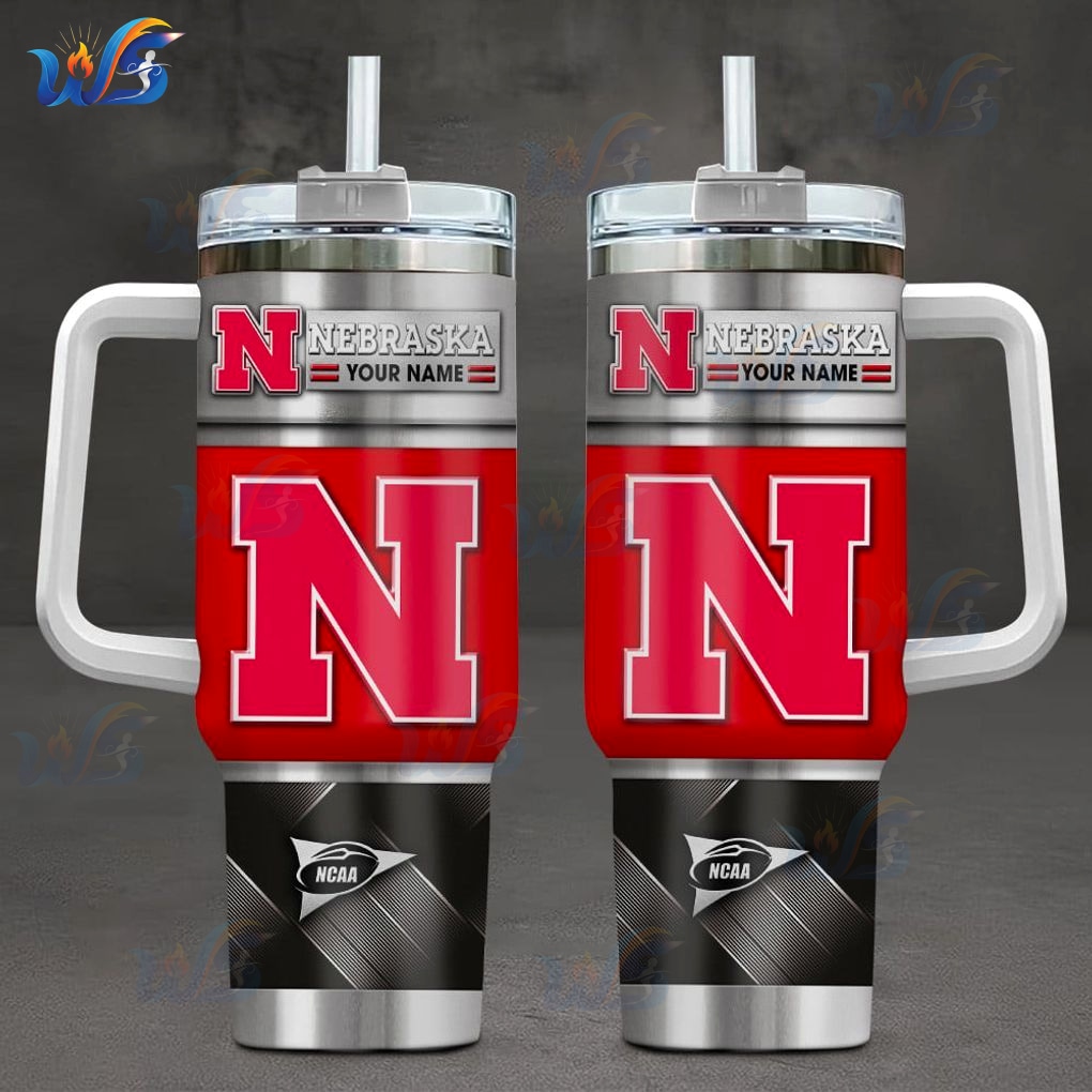 Right at the top, you’ll spot the ‘N Nebraska’ logo, cleanly rendered against a silver plate, which looks super sharp. And what customers love most about this specific section is the ‘YOUR NAME =’ feature – it means you can truly make this tumbler your own, adding that personal touch to your fan gear. Below that, the huge, iconic ‘N’ logo dominates the mid-section, outlined in white, making sure there’s no doubt about your allegiance. It’s positioned centrally for maximum impact, making it instantly recognizable whether you’re at a tailgate, in the stands, or just heading to class. This isn’t just a small emblem; it’s a confident declaration of support.
