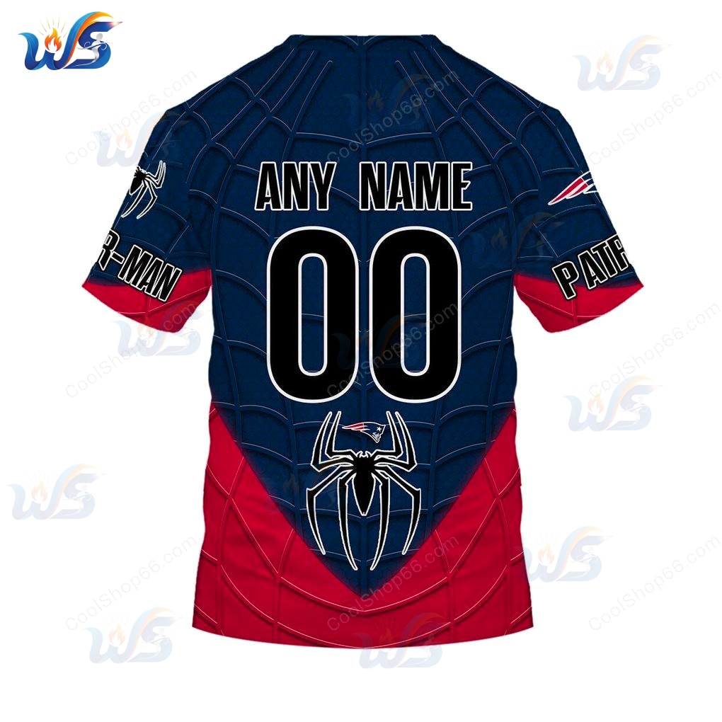 • Dynamic Sleeves: The journey continues down the sleeves. On the left, a smaller, equally sharp Flying Elvis logo reiterates your Patriots pride. But it’s the right sleeve that truly sings of the crossover. Vertically emblazoned is the word “SPIDER-MAN” in a striking white font, a clear nod to the friendly neighborhood hero. Just above this, the classic Spider Symbol – stark black on a white background, with its distinctive legs reaching out – perfectly captures the essence of agility and power. This deliberate placement tells a story, making each arm a tribute to one half of your ultimate fandom.
