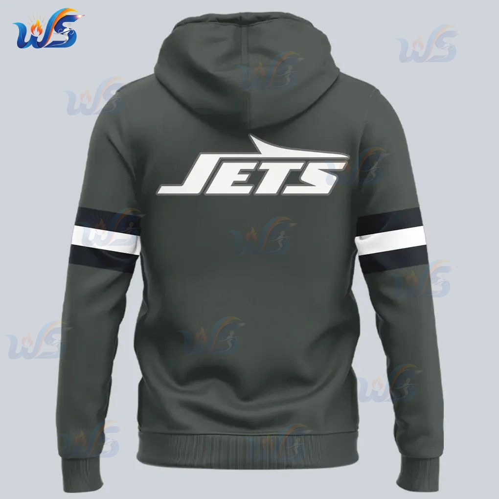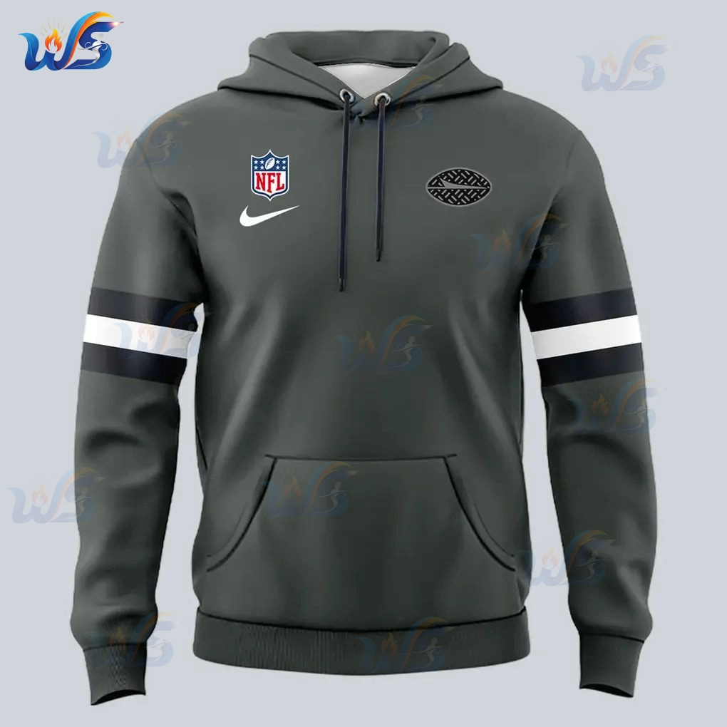 Traditional team colors can often limit versatility, clashing with everyday outfits or feeling out of place. The unique charcoal base color of this New York Jets 2025 The Rivalries Uniforms Hoodie directly addresses this. It allows for more subtle integration into a wider wardrobe, maintaining its Jets identity through the bold back logo and sleeve stripes, but in a refined palette. This design choice tackles the problem of wanting to wear team gear frequently without sacrificing personal style, enabling confident expression in any environment.