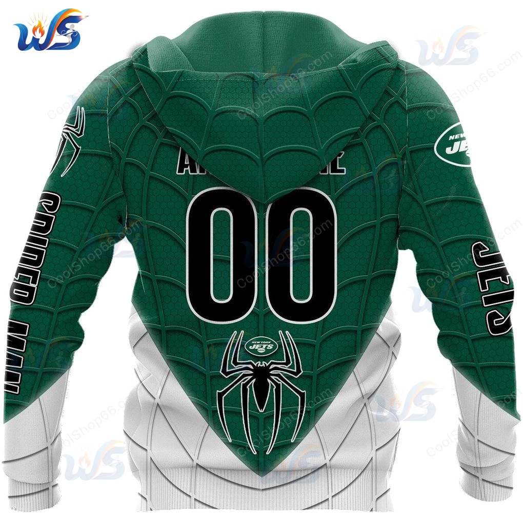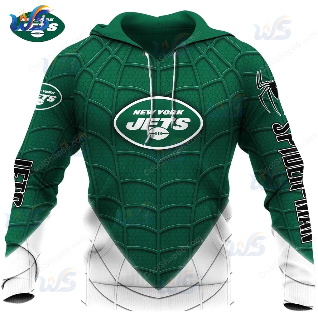 The design team for this New York Jets x Spider Man 2025 Excellent Design Hoodie clearly set out to create a genuine fusion. They wanted to capture the dynamic energy of both the Jets and Spider-Man, embodying speed, agility, and local pride. They chose the unmistakable Jets green as the dominant color, grounding it firmly in team spirit. Layered in are crisp white and bold black accents, crucial to both brand identities. The white forms striking, web-like panels on the lower body, giving it that iconic Spidey suit aesthetic.