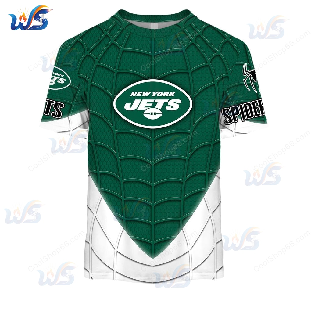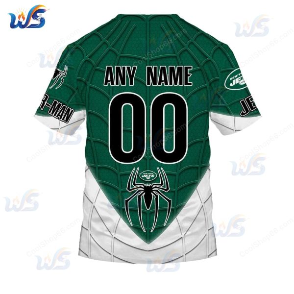 Right at the center, you’ll find the classic New York Jets oval logo, placed proudly on the chest, solidifying your allegiance. Vertically along the sleeves, “SPIDER-MAN” appears on one side and “JETS” on the other – a clever balance. Above “SPIDER-MAN” is a sleek black spider emblem, a subtle nod. On the back, the vibrant green with its subtle hexagonal web pattern continues. The customizable “ANY NAME” and “00” in bold black lettering are a fantastic touch, letting you personalize your fandom. Below that, the white web pattern from the front culminates in a larger, striking black spider logo, signifying the superhero’s presence. Everything works together because the designers truly understood the visual language of both brands.