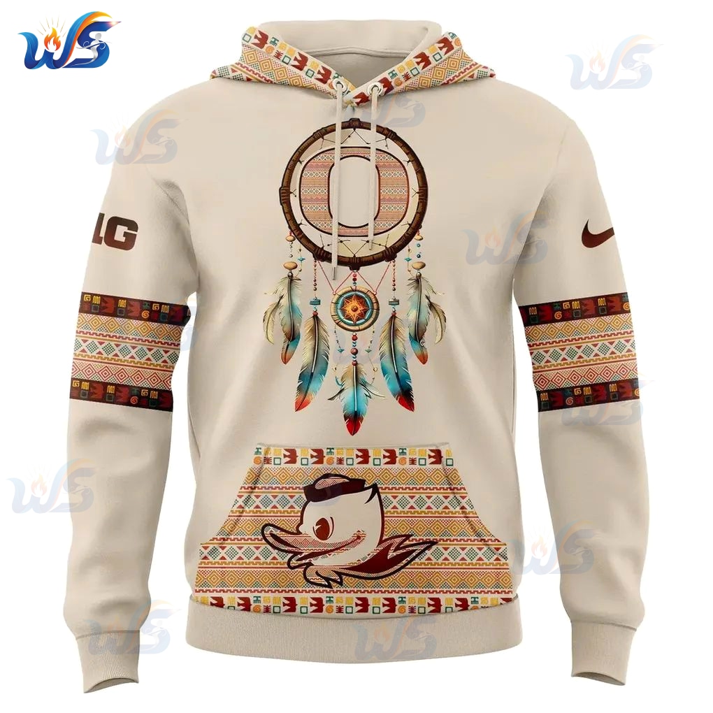 The design of the Oregon Ducks 2025 Native American Heritage Month Hoodie directly addresses the problem of finding truly meaningful and respectful fan wear. Where other team apparel might stick to basic logos, this design transcends the ordinary by integrating profound cultural symbolism. The prominent dreamcatcher graphic on the front, centered with the iconic “O”, isn’t just a pretty picture; it directly solves the challenge of superficial representation. It prevents the hoodie from feeling like just another piece of merchandise, instead imbuing it with a narrative that honors Native American traditions. The intricate, colorful patterns adorning the sleeves, the hood lining, and the front pocket are also thoughtfully chosen. They eliminate the common annoyance of generic patterns, offering a visually rich tapestry that acknowledges indigenous artistry. This choice of pattern solves the problem of designs that lack depth or connection, ensuring every detail contributes to the overall message of heritage and appreciation. Furthermore, the balanced cream base color with vibrant accents prevents the design from being overly flashy or hard to wear. It’s a striking yet harmonious combination that allows you to make a statement without overwhelming your personal style. They positioned the Oregon Duck mascot subtly within the heritage pattern on the pocket specifically to solve the need for continued team spirit without overshadowing the cultural theme, creating a cohesive and respectful blend. This problem-preventing design ensures you can wear your pride with confidence and purpose.