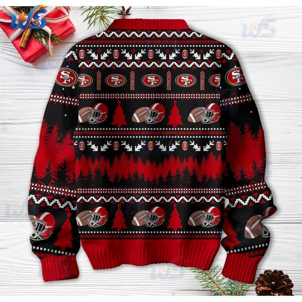 The design also focused on longevity. Ribbed cuffs, collar, and hem prevent stretching, keeping the sweater’s shape, crucial for repeat wear. Unlike thinner knits that sag, this maintains a consistent fit. Detailed football helmets and crisp 49ers logos repeat across the sleeves and back. This isn’t just decoration; it prevents the sweater from looking bland or generic from behind, ensuring team spirit from every angle. It’s a direct solution to single-sided designs that disappoint fans.