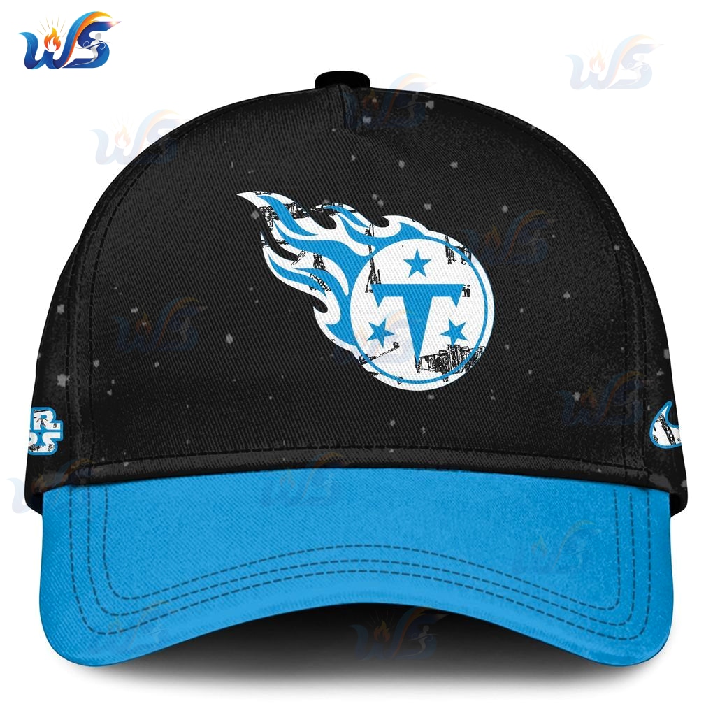 On the front, the legendary “TITANS” wordmark commands attention, rendered in a distressed, ice-blue and white palette. But look closer, fellow fan—within the rugged texture of each letter, you’ll discover faint, ghostly outlines of iconic starships and subtle galactic symbols, an ingenious integration that speaks directly to the discerning eye of a true fan. This isn’t just text; it’s a hidden constellation of reverence. Below the main wordmark, the iconic flaming thumbtack emblem of your beloved team blazes in a matching distressed blue and white, its fiery spirit intact, even amidst the cosmic dust. To the right, a smaller, universally recognized emblem from the galaxy far, far away hints at the extraordinary collaboration, while an official league crest signifies its authentic connection to the game you love. Our designer’s vision here was to infuse the team’s grit with galactic lore so seamlessly that it feels like the Titans have always been a force in the cosmos, a bold step beyond the generic team wear that often dominates the market.