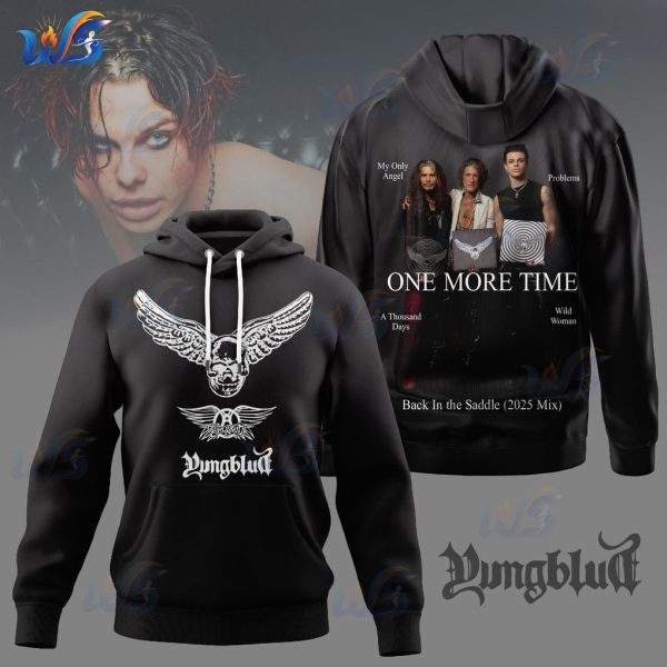 Turn to the back – where the concept truly comes alive. Here, the imagery of Steven Tyler, Joe Perry, and Yungblud together alongside textual references like “ONE MORE TIME” and “Back In The Saddle (2025 Mix)” provides a powerful narrative. This visual storytelling directly solves the problem of generic merchandise lacking depth. Instead of a simple album cover, this design creates intrigue and celebrates a conceptual collaboration, helping you to project a sophisticated and forward-thinking fan persona. The detailed song titles enrich the story, giving depth beyond surface-level fandom. It transforms the shirt into a conversation starter, preventing awkward silence. The dark base color with crisp white graphics also solves the problem of visibility, ensuring your statement is clear and bold without overwhelming your style, making a confident statement.